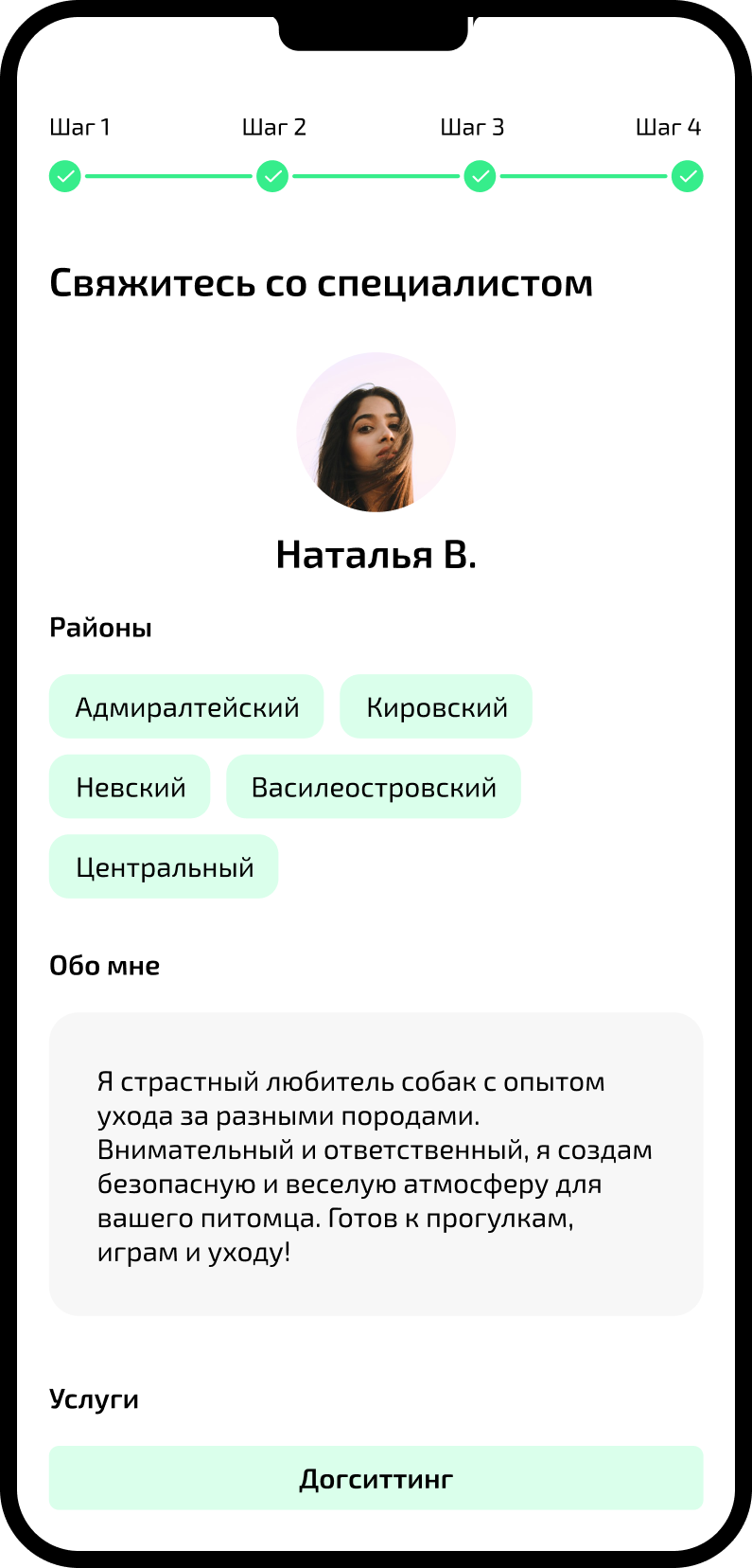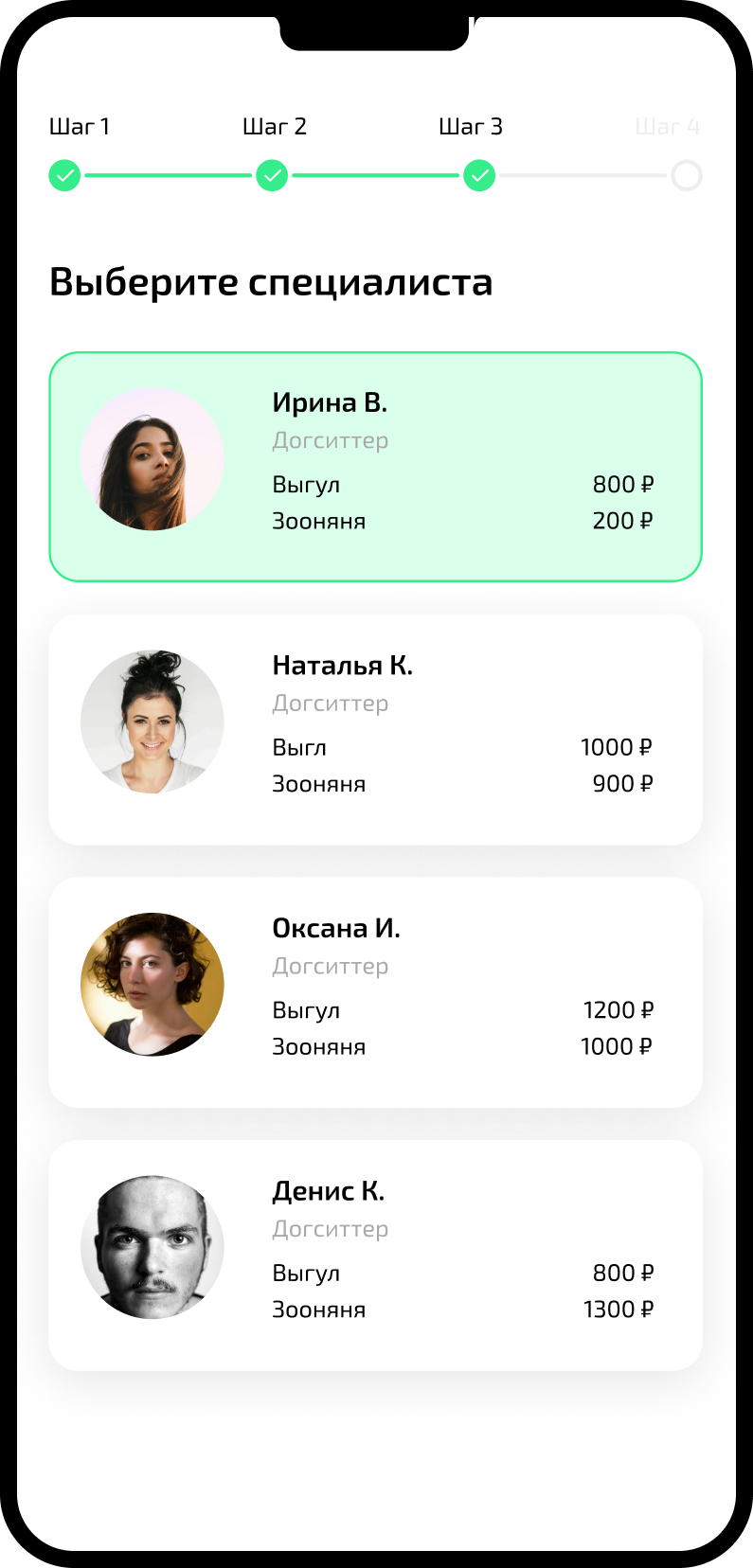 Наш сервис — это не биржа для подработки, где любой человек может зарегистрироваться и ухаживать за вашей собакой. Каждый кандидат проходит отбор, прежде чем брать заказы.
